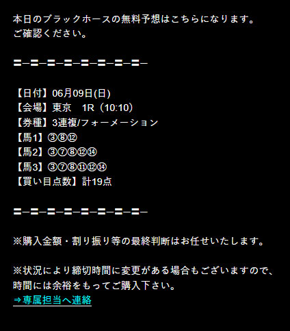 6月9日(日)に公開されていた買い目がこちらになります。