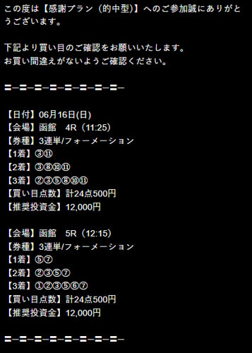 それでは『感謝プラン』で公開された買い目がこちらになります。